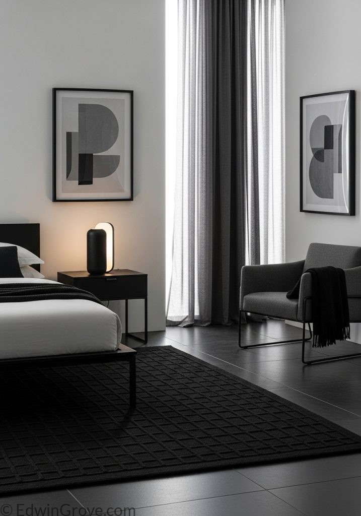 Rugs and accessories complete the look in modern black bedroom accessories styling. A patterned rug can soften the boldness of black floors. Small decor pieces like vases and lamps add personality. This is essential for black bedroom rug ideas. Accessories bring warmth and balance. They tie the entire design together.